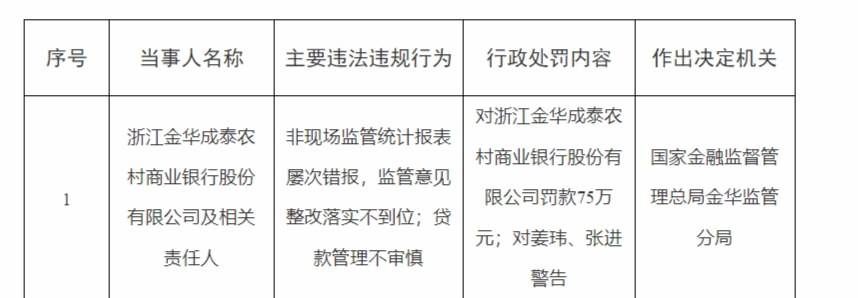 7月30日,浙江金华成泰农村商业银行股份有限公司,非现场监管统计报表屡次错报,监管意见整改落实不到位;贷款管理不审慎优秀股票配资网站,被罚款75万元;姜玮、张进被警告。